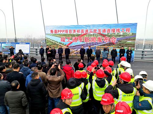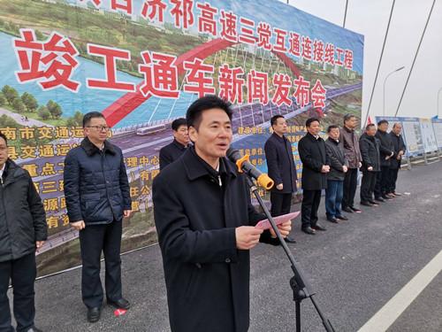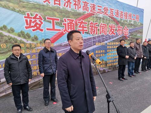 岳锐在致辞中指出,济祁高速三觉互通连接线工程工程自2017年开工以来,在寿县开源(基础设施建设工程有限)公司的科学组织下,在县重点局和新桥管委会的协调管理下,通过中煤第三建设(集团)有限责任公司和安徽开源路桥有限责任公司2年来的日夜奋战,如期完成了建设任务,2019年12月13日通过竣工验收,现已具备竣工通车条件。在省市关心支持下,在各乡镇、县直有关单位的共同努力下,全县交通建设迈入快车道。建设国省干线66公里、农村公路1989.93公里;完成1座公交枢纽、1座一级客运站、1座综合客运枢纽建设;济祁高速寿县段78公里建成通车,并配套建设高速公路连接线17.73公里;合肥至周口高速(保义至南照)寿县段全长约24公里,规划设双门、迎河互通;商合杭高铁寿县站通车运营,并实现与高铁综合客运枢纽无缝对接;江淮运河寿县段93.45公里、投资8.37亿元的瓦埠湖大桥及连接线工程正在建设。今天,济祁高速三觉互通连接线正式开通运营,沟通了“新桥”与“新城”,连接着“南工”与“北旅”,把经济高速发展的新桥热土与厚值楚汉文化的千年古城,以及“世界双遗产”的安丰塘美丽串联,打开了寿县加速发展的新格局,重要意义不言而喻。它的开通,必然为我县全面参与“长三角一体化”,实现与省会合肥都市圈的深度融合,助力寿县的高速度、高质量发展,发挥重要的作用。